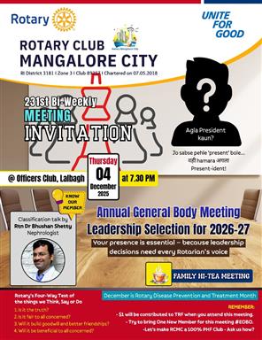 The Rotary Club of Mangalore City conducted its 231st Bi-Weekly Mee. . .